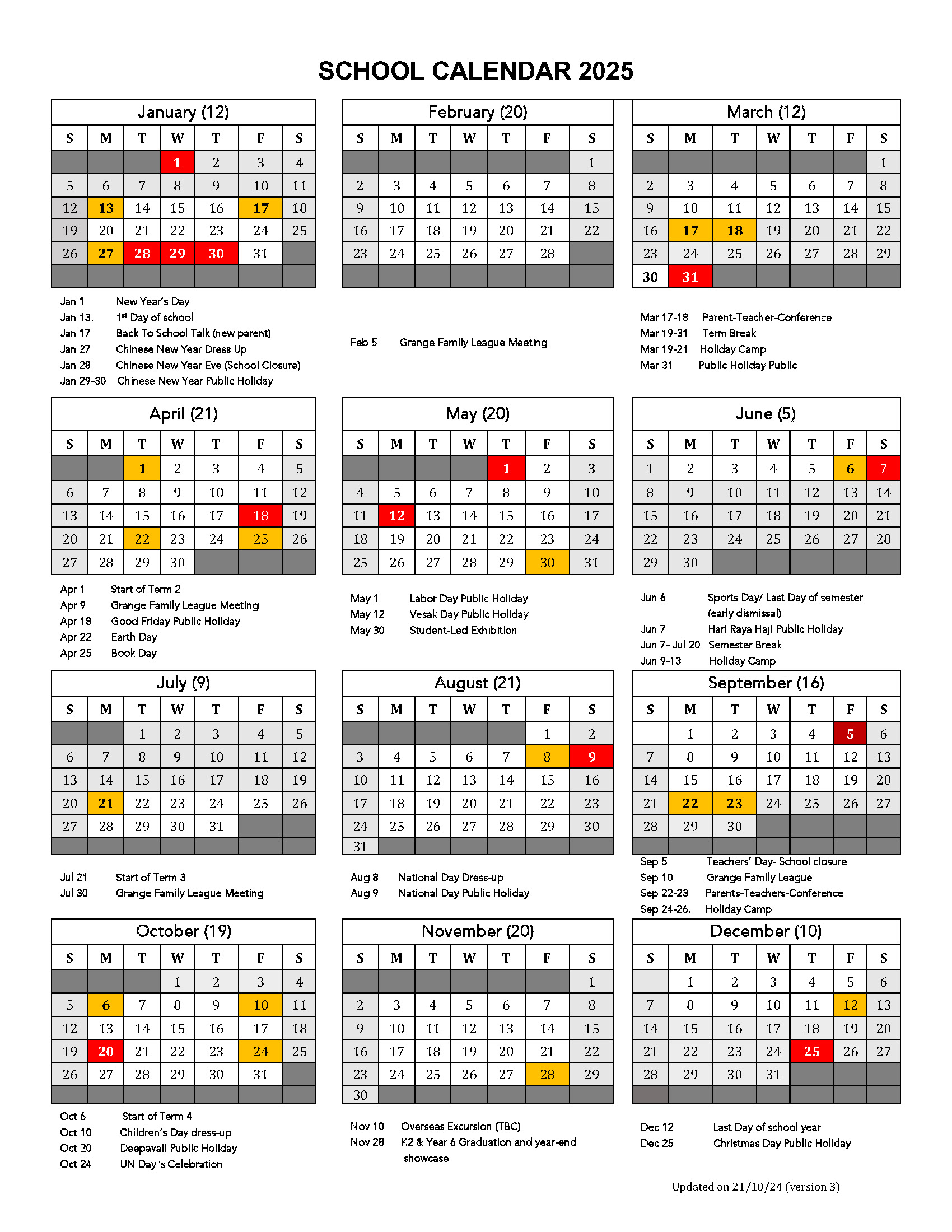 Note: This calendar is accurate as of 21 October 2024. The term dates are fixed (unless due to unforeseen circumstances). Should there be any changes, the school community will be duly informed.